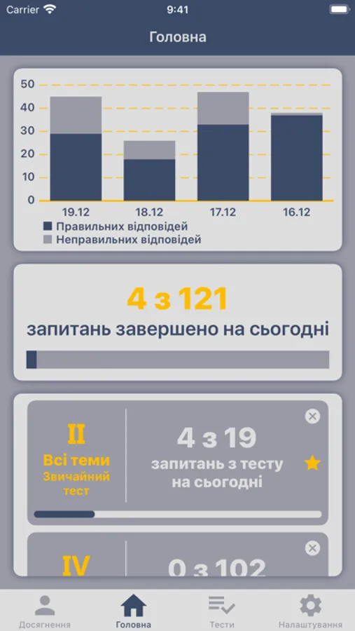 В цьому додатку Ви зможете не тільки вивчати матеріал і проходити тести, але і побачити порівняння Ваших результатів із результатами інших користувачів, що проходять тестування.