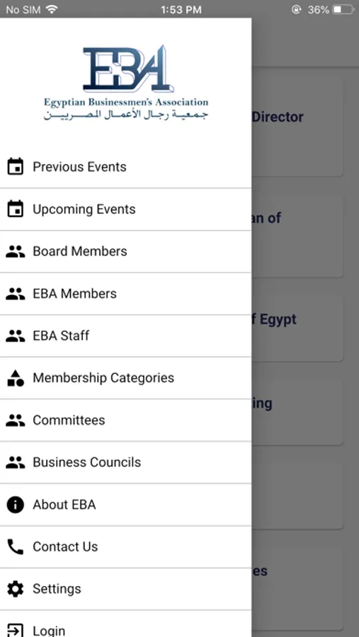 This application includes EBA previous and upcoming events with reminding options as well as clipping options for EBA news, list of EBA members with members' details, members' news, Board members, Committees with committees' members, Business Councils with councils' members and Annual Reports .