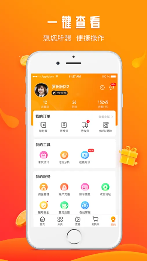 随时随地采购最新商品,支持跟单补货。支持扫码识别商品等。