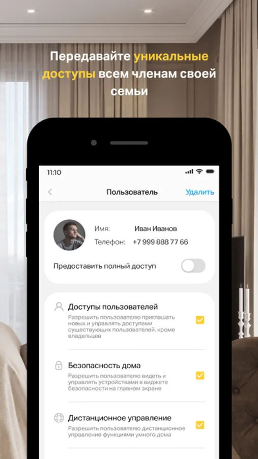 Управляйте доступами членов вашей семьи к управлению Умным домом, назначая роли и права доступа.