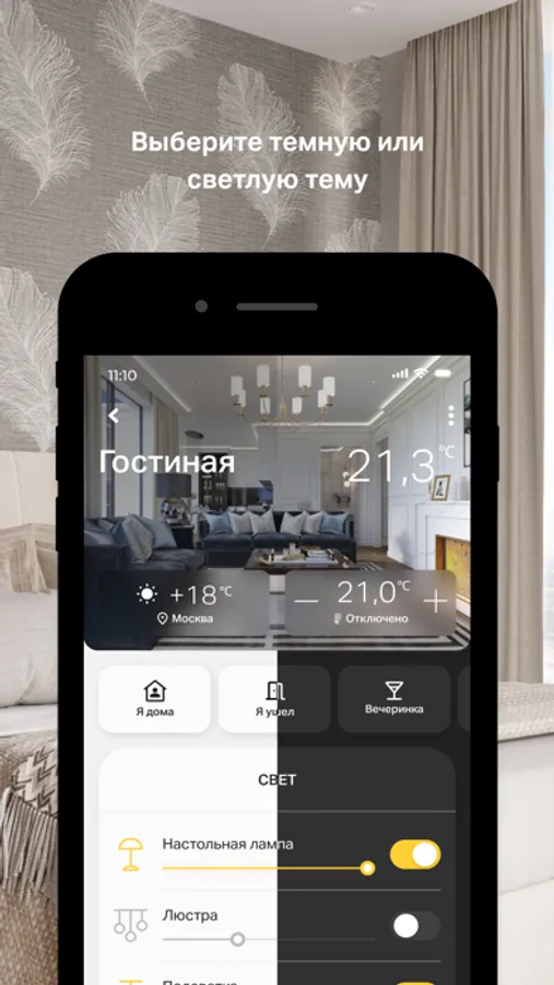 Управляйте освещением, шторами, климатом, теплыми полами и домашней техникой в несколько кликов. Настройка всех устройств доступна прямо из приложения.