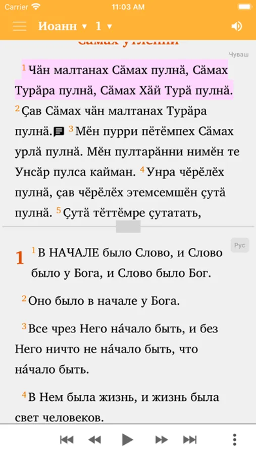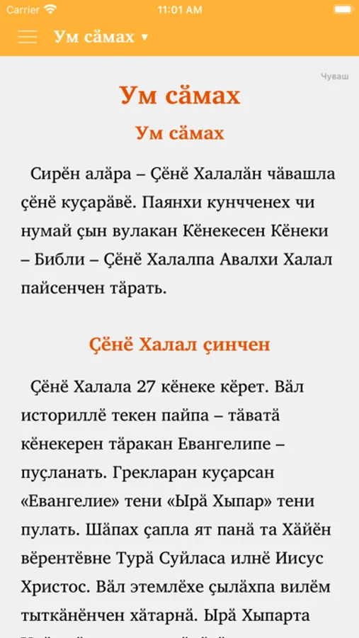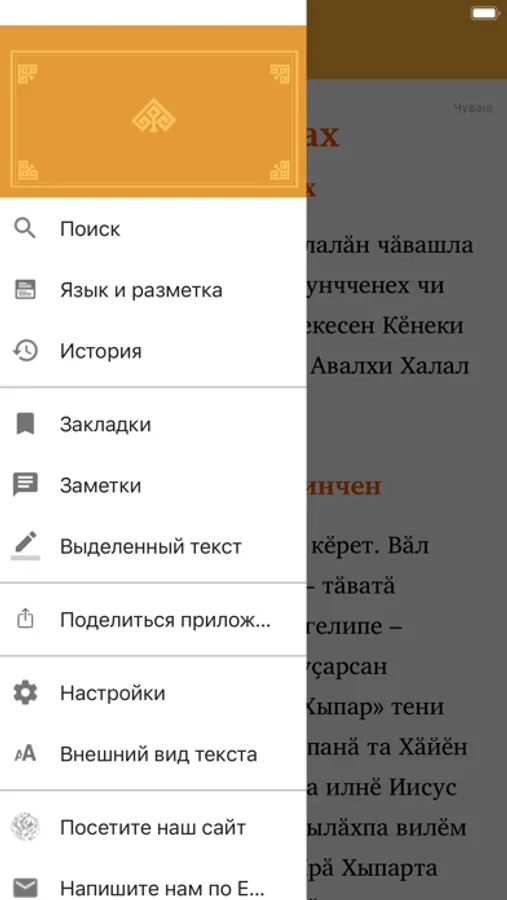 This online application presents an opportunity to study the Scriptures. It contains both the Chuvash translation itself and the Russian Synodal translation, which can be connected in parallel if desired. Users can highlight verses in different colors, place bookmarks, write notes, and view the history of readings.