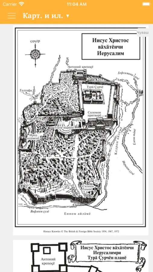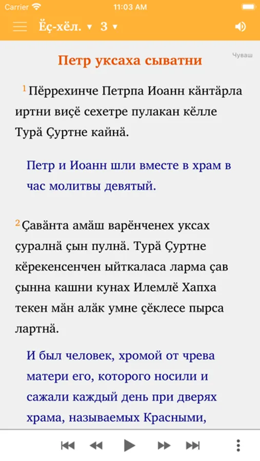 The app also includes a brief glossary of key terms, place names and proper names, photographs, and maps of biblical places. There is also an option to download the audio of the Chuvash translation online to the internal memory of the device and listen to it later.
