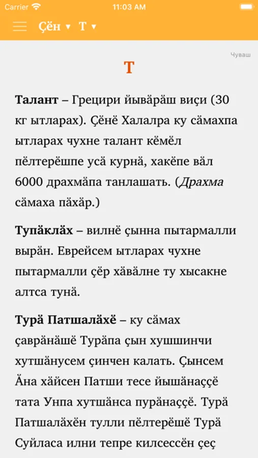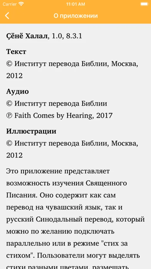 The app is intended for speakers of Chuvash, as well as those who are interested in it. It includes translations of the New Testament into the Chuvash language by a team of the Institute for Bible Translation (IBT) specialists in biblical and linguistics.