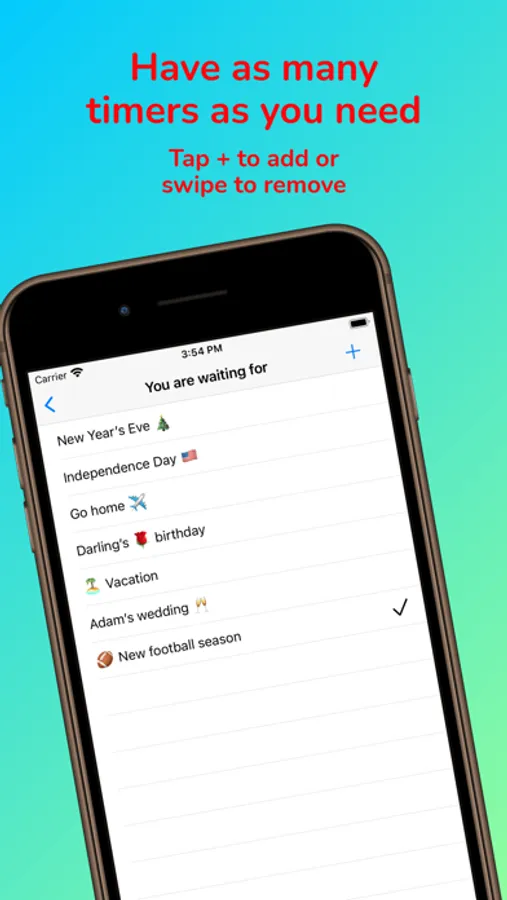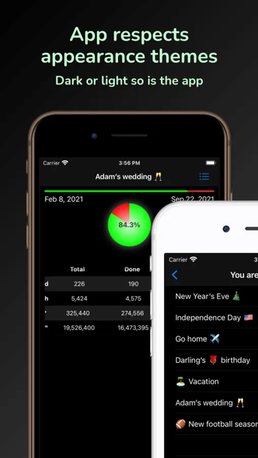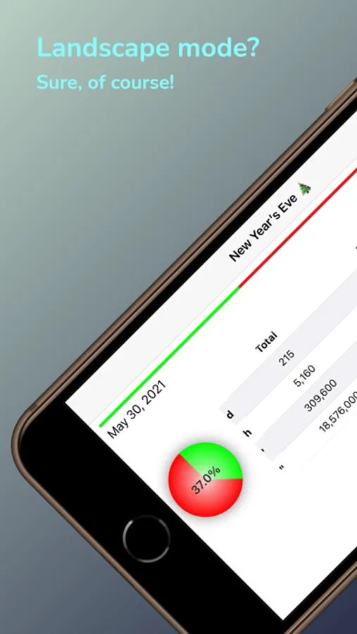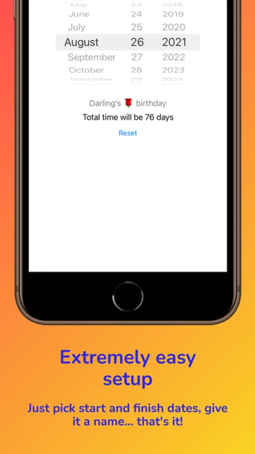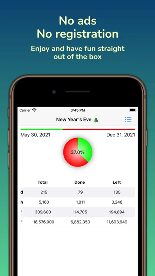 Once you complete the setup the app will show you how much time has already passed and how much time left until the event. Here comes the funny part! Besides the graphical representation you will be given numerical indication in different time units. Who would measure time in seconds on a scale of weeks or months? We would! It is just so much fun to see how you get closer to your goal every second.