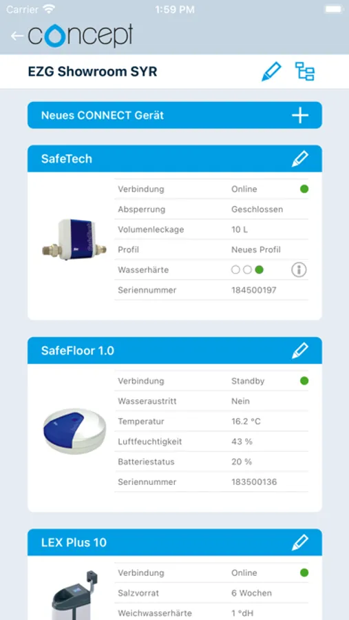 concept steht für intelligente und technologisch hochwertige Produkte für das Fachhandwerk. Variable Kombinationsmöglichkeiten des haustechnischen Programms erlauben eine individuelle Gestaltung im Sanitär-, Installations-und Heizungsbereich. Die internetfähigen Geräte im Bereich Leckageschutz und Wasserbehandlung können über die kostenlose concept App bedient werden. Das System ist vernetzt, alle Armaturen kommunizieren und interagieren. Sie können neue internetfähige concept Geräte hinzufügen, Projekte anlegen und alles online kontrollieren und steuern inkl. Urlaubsfunktion. Mit Sicherheit alles im Blick für Ihre Hausinstallation!