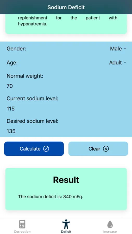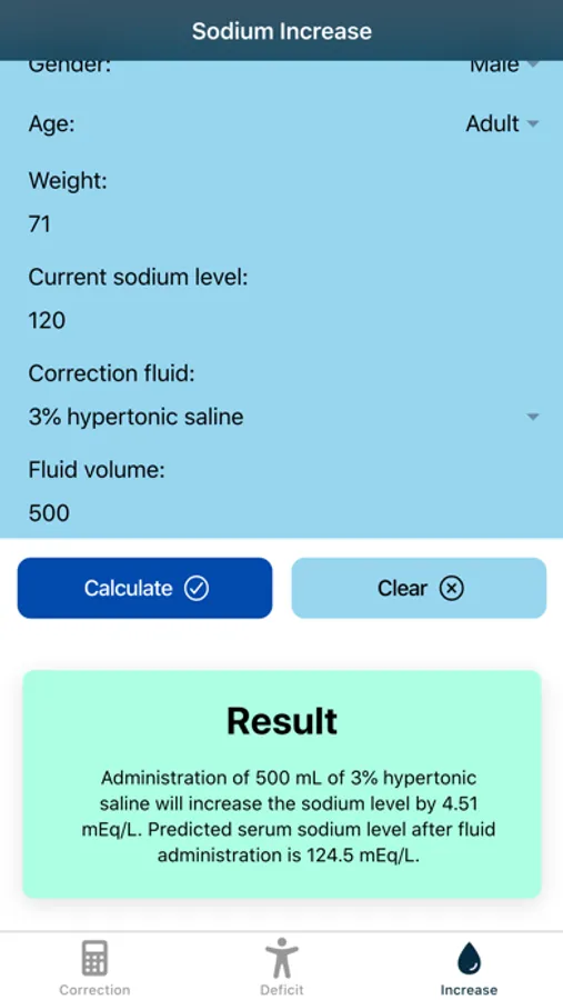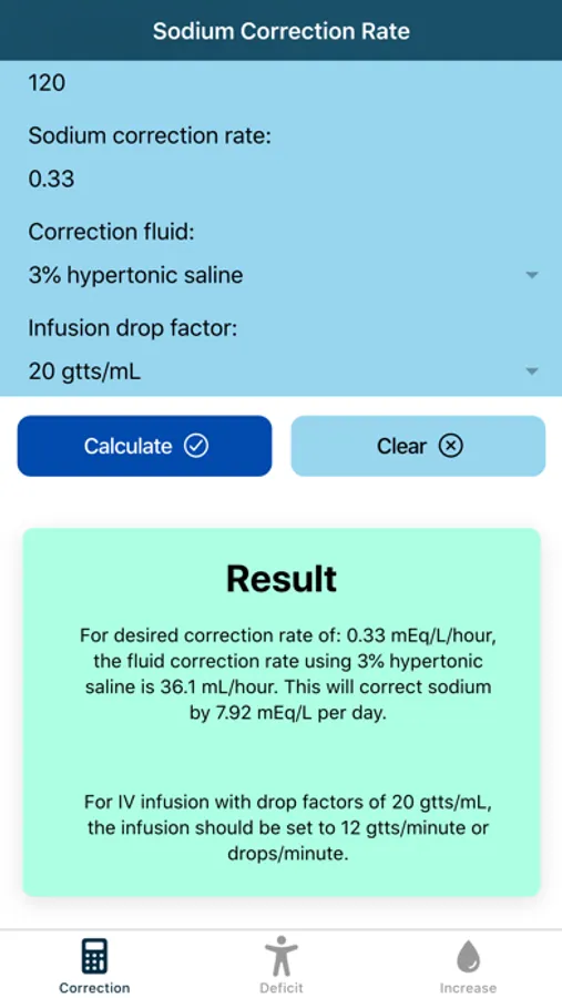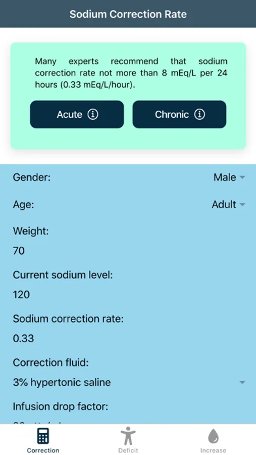 Disclaimer: all calculations must be re-checked and should not be used alone to guide patient care, nor should they substitute for clinical judgment. Calculations in this "Hyponatremia Calculator: Sodium Correction Rate" app might be different with your local practice. Consult to expert doctor whenever necessary.