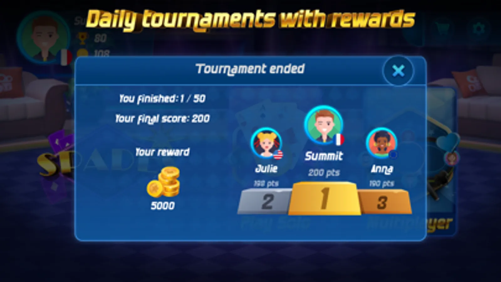 Spades is a team game. Bid the number of tricks you think you can win. If you reach that number, you will earn points, otherwise, you will lose some.