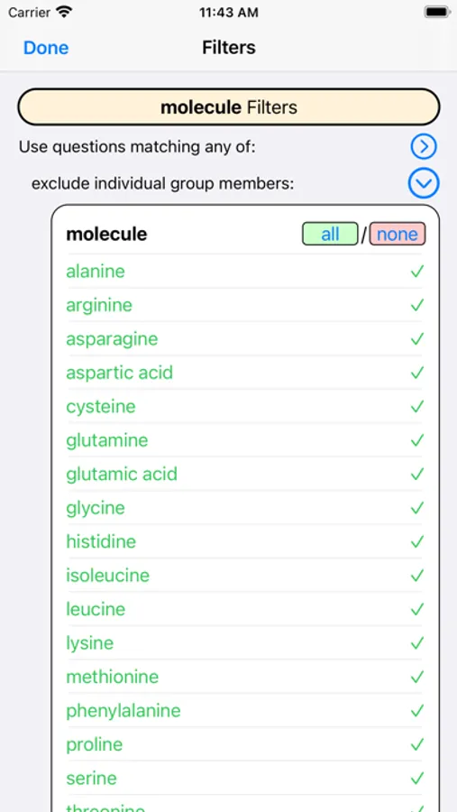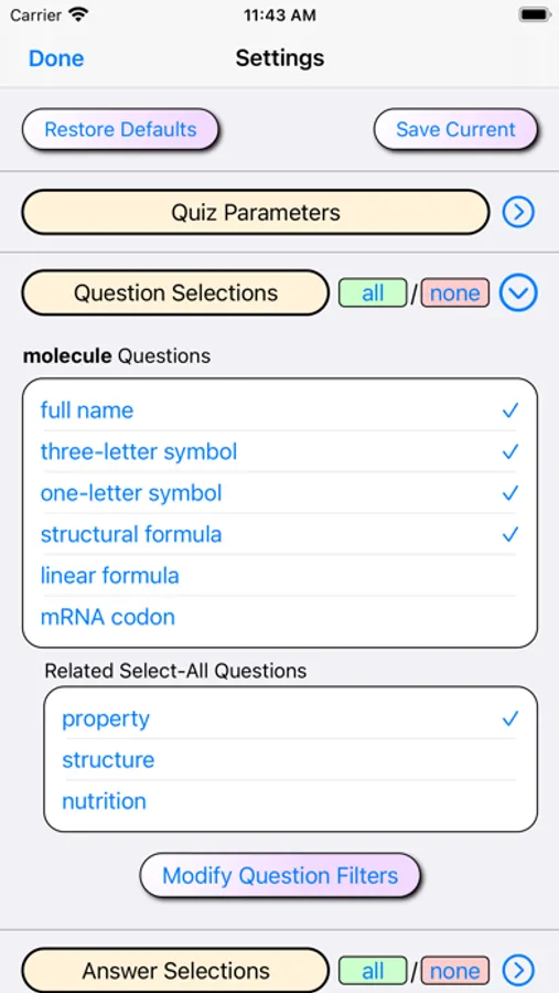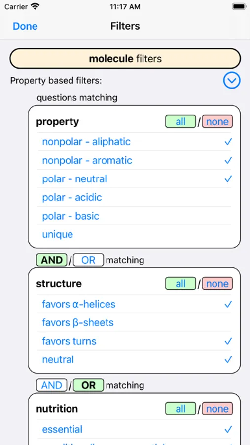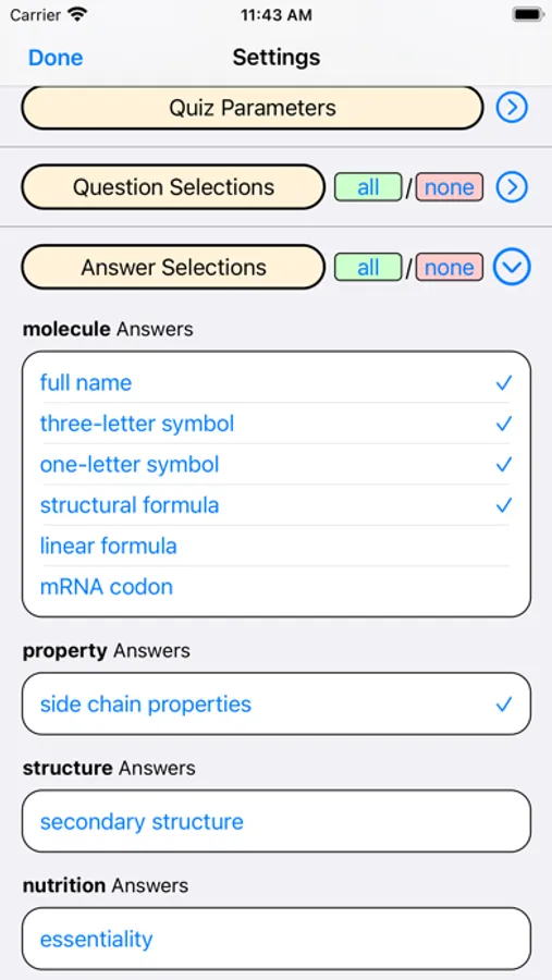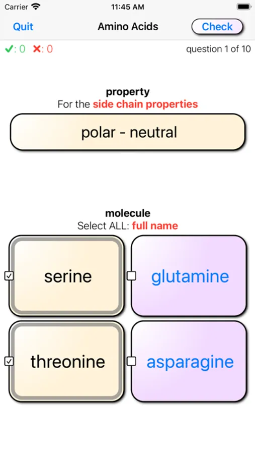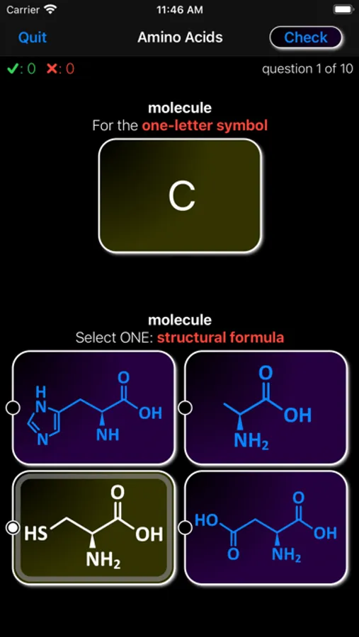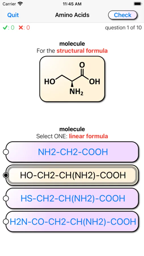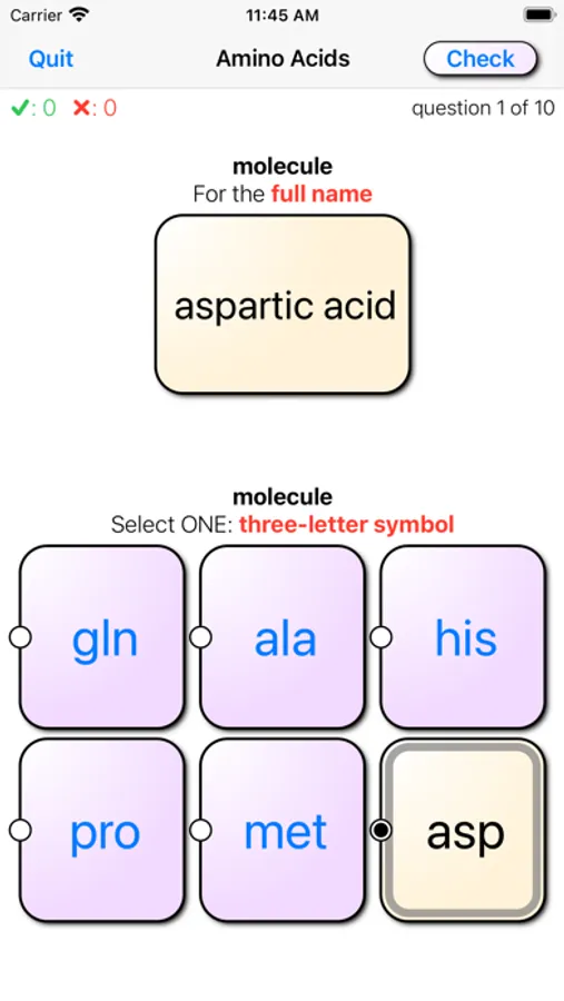 All of this allows you to configure the app to help you quickly learn the amino acid properties, chemical names, abbreviations, and chemical structures. It is an ideal study aid for biology and biochemistry students who need to memorize various portions of this information.