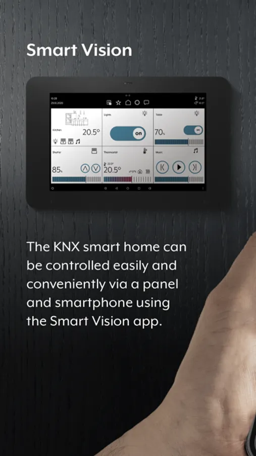 The JUNG Smart Vision app is the remote control of your Smart Panel 8. Control the innovative touch display from JUNG in your home network - lighting, shading, heating, music and many other smart home functions. Always well informed: specific events such as an opened window are clearly displayed. Up to ten app users can be stored for use in the Smart Panel 8.