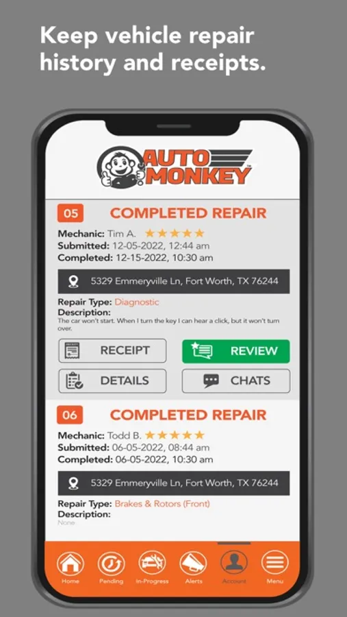 Auto Monkey is the mobile car repair service that comes to you. Backed with a 24-month/24,000 mile warranty. The Auto Monkey app provides a range of services from oil changes, brake repair, alternator and starter motor and belt replacements, tune-ups, radiator, A/C and heater issues, suspension and more. Vehicle repairs are quality and pricing is often better than traditional brick-and-mortar shop options. No Cash Transactions. All payments are made thru app's secure checkout process. There's no money exchange between the mechanic and the customer, and there are no membership fees. The Auto Monkey app provides safe, affordable and reliable mobile car repair services.