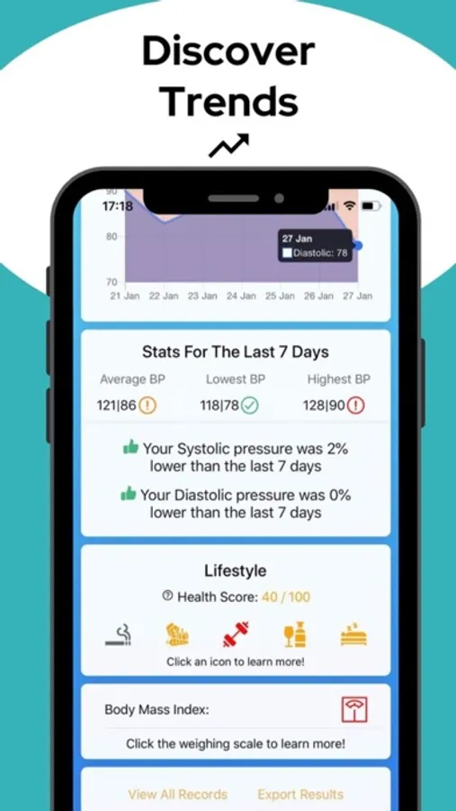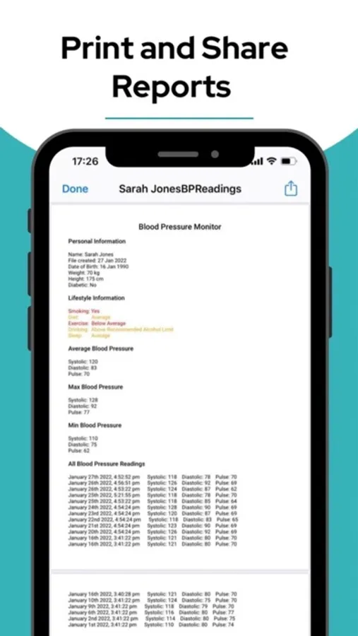 -Record lifestyle information including sleep quality, diet, alcohol intake, exercise, and smoking status. A mean health score is automatically calculated to help you analyse trends and lifestyle changes to help with blood pressure.