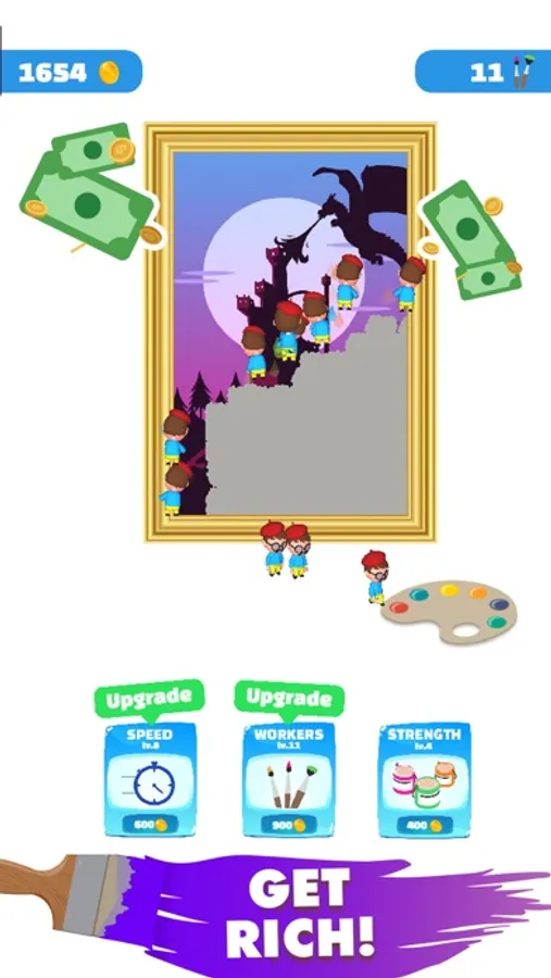 You're an aspiring artist that’s just opened up your very own dream gallery. The only thing is, where’s the customers? Grab your brushes and get ready to paint the canvas green with money! You’ll travel to locations and manage your artist to paint the most iconic of pictures like the Mona Lisa and more. Take on the management of your studio by selling art to collectors from around the world. As you progress, you’ll unlock VIP customers that will pay top dollar for one of a kind art.