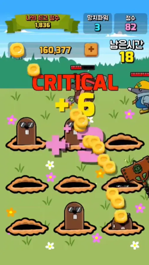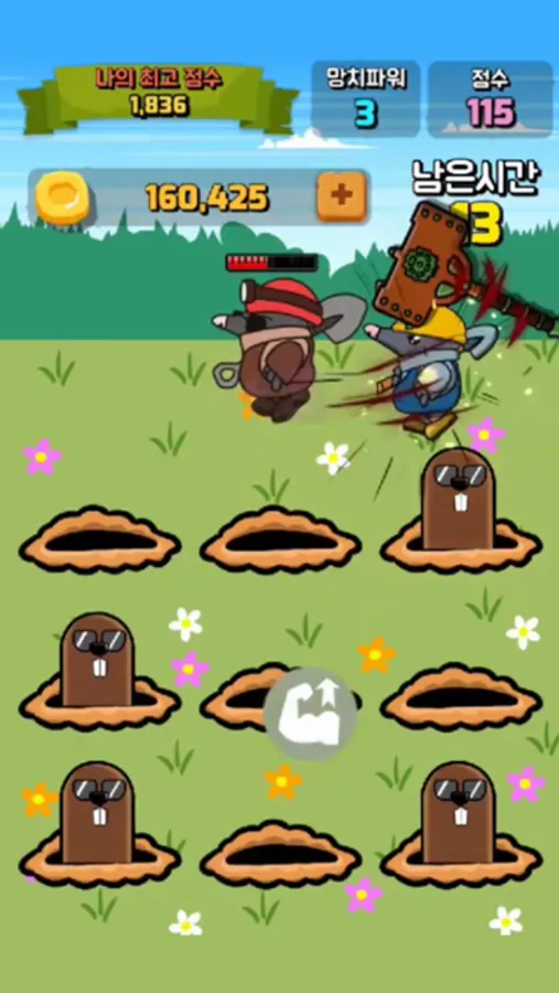 망치파워가 높을 수록 두더지를 때릴 때 1대당 점수가 높아지고,