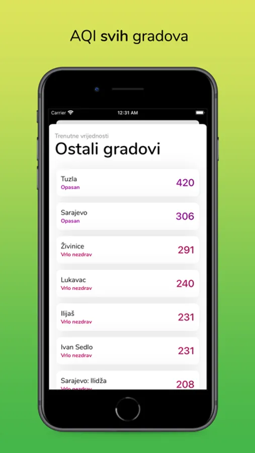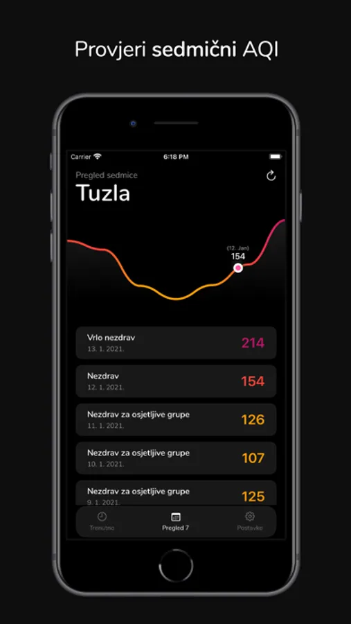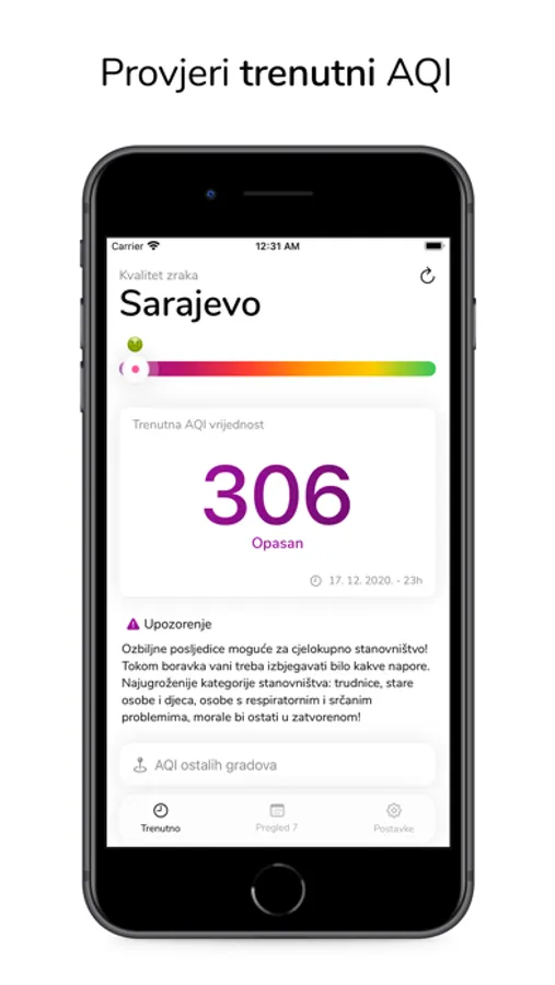 Saznajte trenutnu vrijednost indeksa zagađenja zraka za Vaš grad ili pogledajte sedmični prikaz AQI vrijednosti. Aplikacija je potpuno besplatna i napravljena je s ciljem podizanja svijesti o lošem zraku u Bosni i Hercegovini.