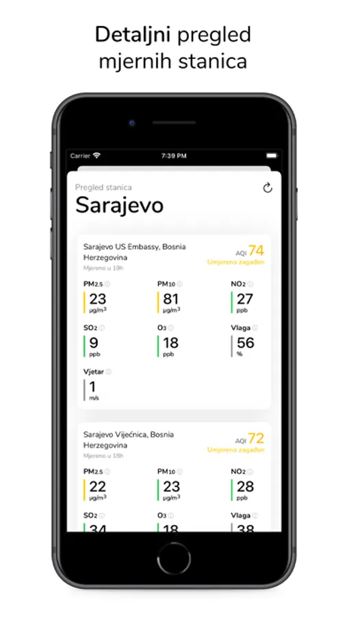 Za svaki grad unutar aplikacije možete provjeriti sve parametre mjerne stanice koji utiču na kvalitet zraka.