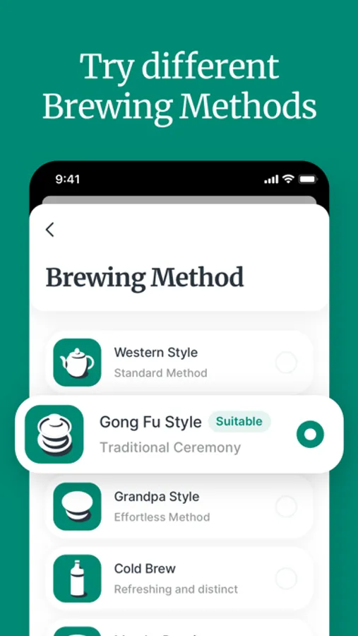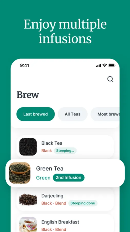 - Your last used brewing method and water amount is saved for each tea