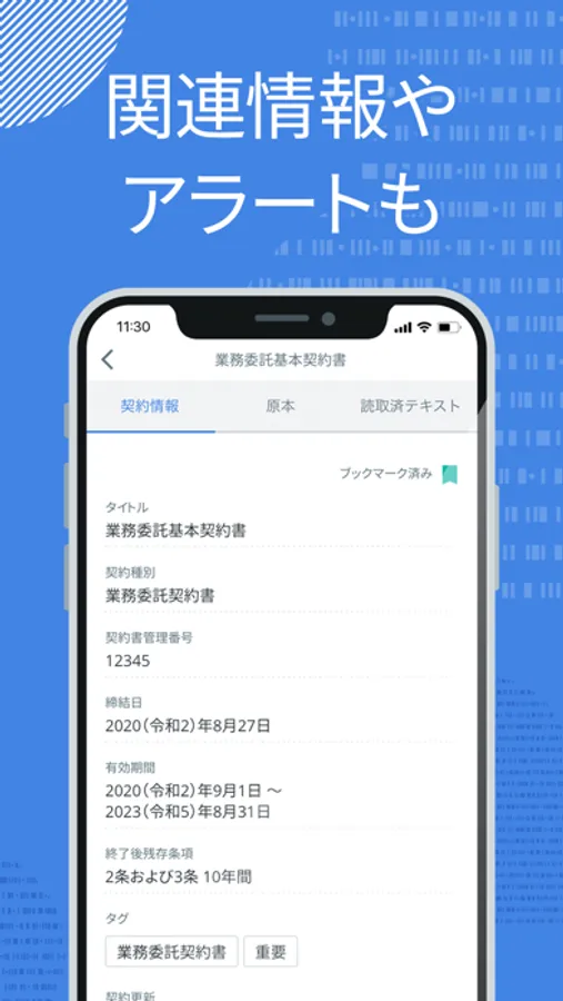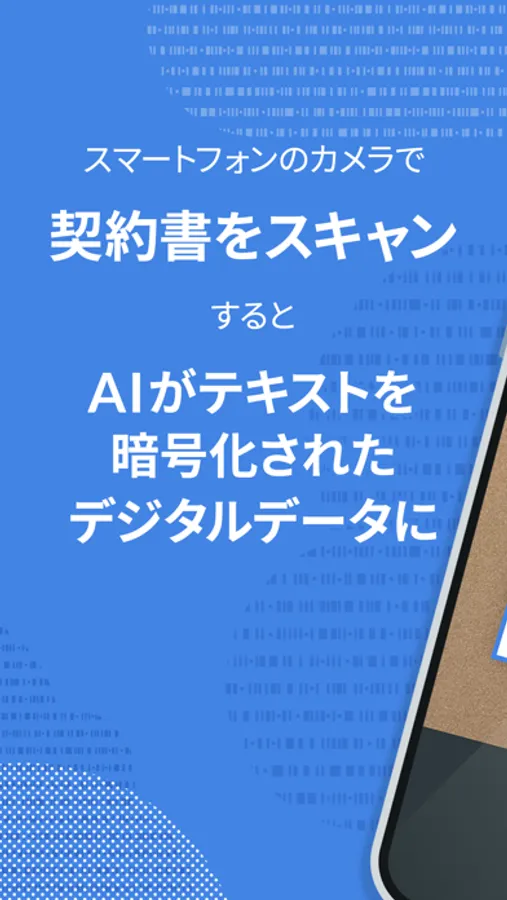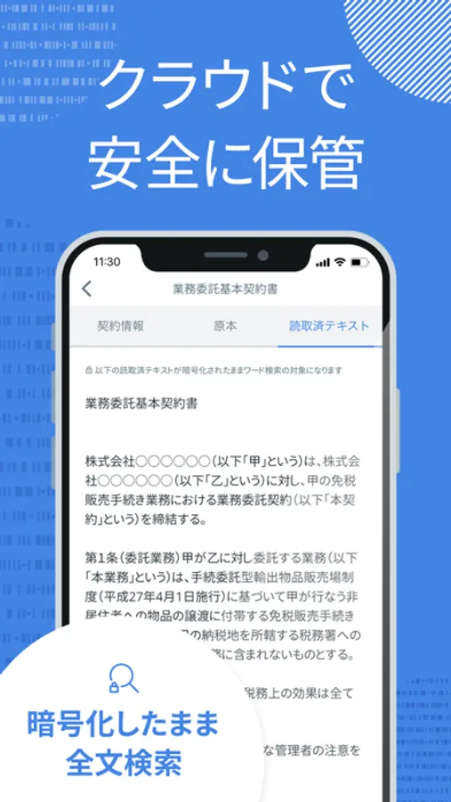 紙の契約書は製本したままスマートフォンでスキャン。斜めからでもまっすぐに補正して取り込みます。AIを活用した高精度なOCR処理でデジタルのテキストデータに変換し、暗号化してクラウドに安全に保管します。スマートフォンアプリでスキャンした紙の契約書だけでなく、PCでアップロードしたPDFからも、同様にOCR処理が可能です。