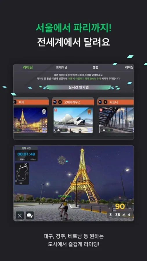 홈트레이닝 ‘야핏’ 수만 명의 친구들과 함께 달리며 서울, 대구 국내뿐만 아니라 프랑스 파리, 미국 하와이 등 전세계에서 언제든 즐겁게 라이딩하세요.