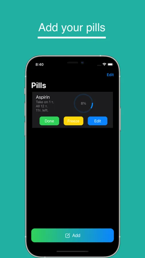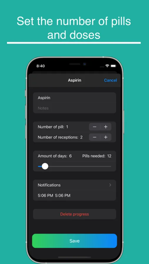The Tablet app will remind you to take your medicines at the right time, prescribed by you. You can configure up to 5 notifications per drug. Track how much is left before the completion of the course of admission. The application will also calculate how many tablets are needed for the course, depending on how many tablets to take at a time, how many times a day, and the duration of administration in days. Usually the recipe contains the number of days, not the dates; in the application, you also need to specify the number of days to repeat reminders.