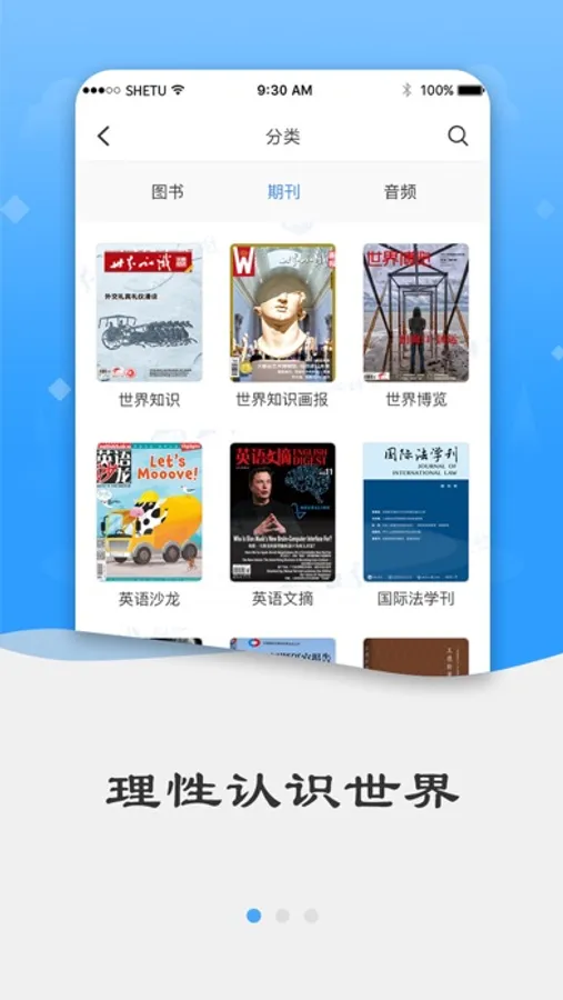 世界知识借阅平台是服务于出版社用户,实现资源有效利用的一款可以听音频、看电子书的知识服务软件,涵盖丰富的图书、期刊、音频资源,用户可以通过借阅的形式阅读图书、期刊资源,同时支持听书的功能,方便用户的使用。