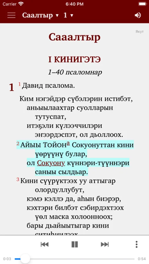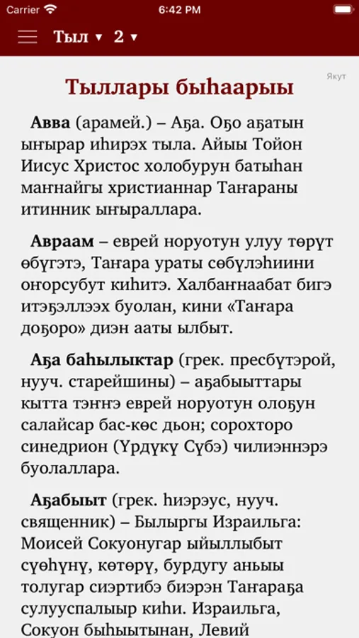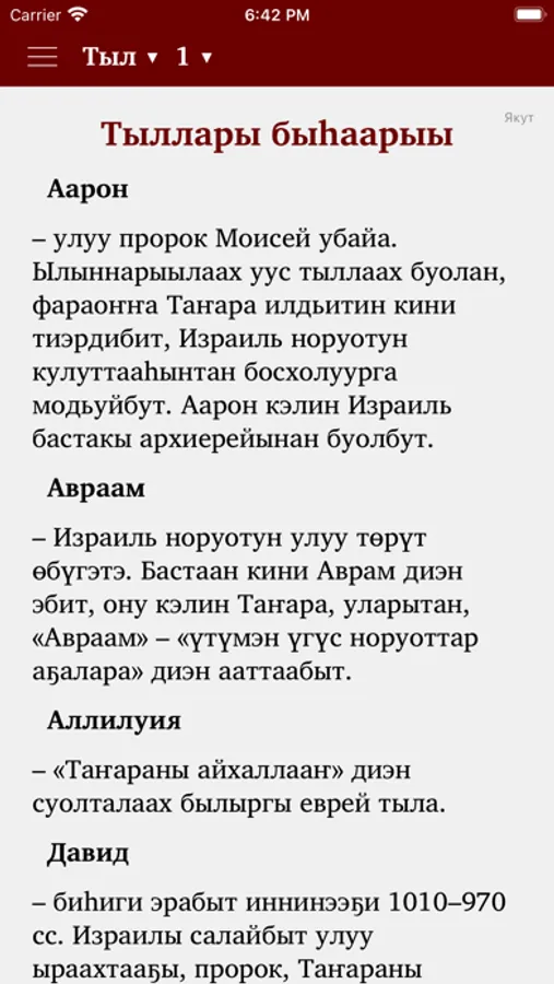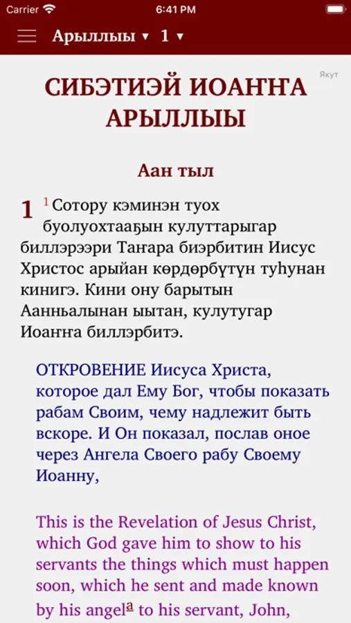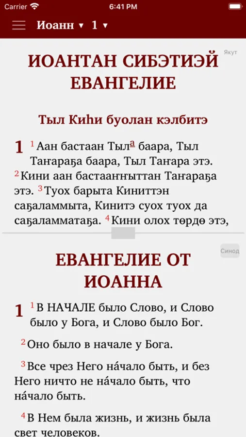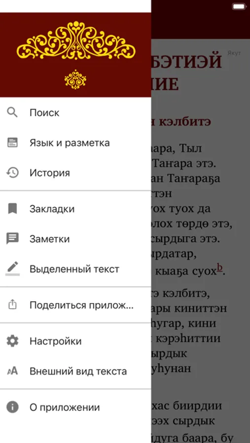 This app is intended for speakers of the Yakut language as well as those who are interested in it. It includes translations of the books of the Bible into the Yakut language by a group of Bible translation and linguistics experts from the Institute of Bible Translation. As the translation project progresses and the translations are published, new texts will be added to the app.