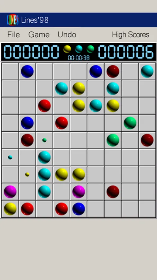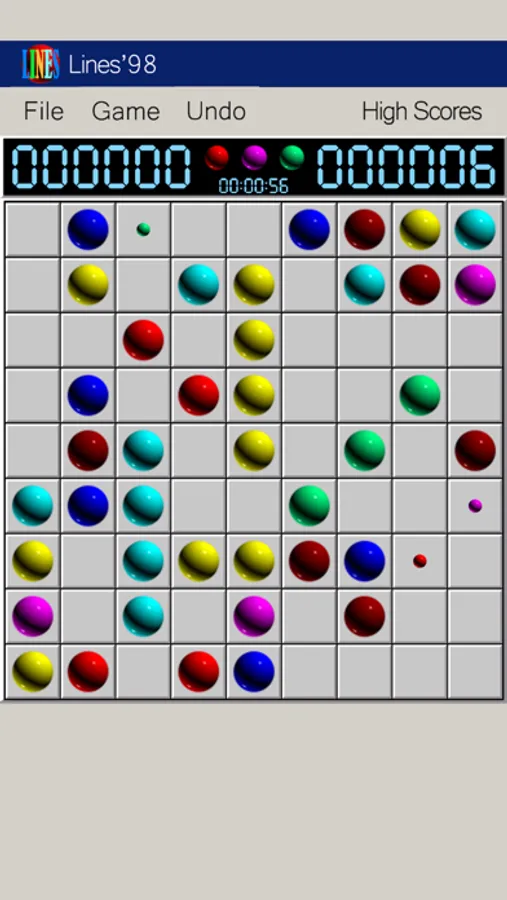 Turn arrange the positions of the balls into a row in which at least 5 balls have the same color along the vertical, horizontal or diagonal lines to remove them from screen.