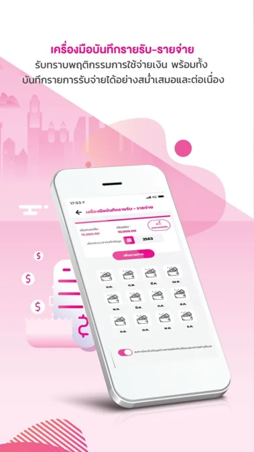 - เครื่องมือทางการเงิน ตัวช่วยสำหรับการคิดคำนวณการใช้เงินในชีวิตประจำวัน รับทราบพฤติกรรมการใช้จ่ายเงิน พร้อมทั้ง บันทึกรายการรับจ่ายได้อย่างสม่ำเสมอและต่อเนื่อง