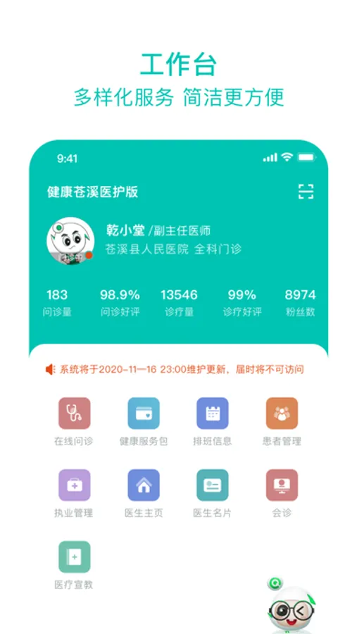 集诊前咨询、诊中就医、诊间支付为一体,通过医患实时交互实现便捷、高效的全流程就医服务,为广大医生用户节省看诊时间,是移动互联时代的行医助手!