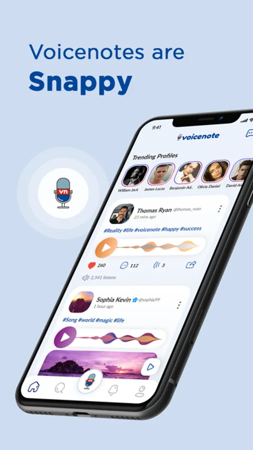 Voicenote is a free audio microblogging and unique social networking service mobile application through which users can interact with each other and with Mega Stars by microblogging, posting, liking, and reposting short voice messages called Voicenotes. Voicenote also provides the interactive feature of longer audio recordings and live audio broadcasting by which users can share their stories and thoughts, however; the feature of interacting via short voice messages (Voicenotes) is what makes Voicenote unique and distinctive from all other current social networking services. The primary purposes of Voicenote are: to enable people and businesses to voice microblog and share their thoughts and stories using their voices globally; to allow fans to verbally interact with and listen to short Voicenotes from their favorite Mega Stars and celebrities, including actors, singers, athletes, politicians, thinkers, and influencers and hear them briefly converse with each other; and to allow verified users and celebrities to audio broadcast live as well as to record longer voice messages (Pods) which are effectively mini-podcasts, that users can opt to "keep listening" to.