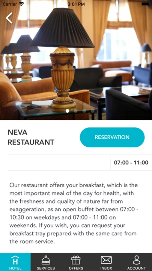 During your stay, you can benefit from Restaurant Reservation, Laundry, Housekeeping, Room Supplies, Room Problem, Wake-Up Call, Tray Collection, Porter services by The Wings Hotel Neva Palas mobile application. Even you can order food and beverages to your room or suite and dine in the comfort of your home. Moreover you can have information about places to visit in Ankara to make your stay more enjoyable.