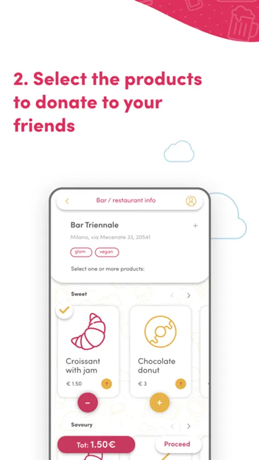 Select an item from the various list proposed by the Sospeso’s Merchants, you can purchase and send your Sospeso to one of your contacts of your phonebook.