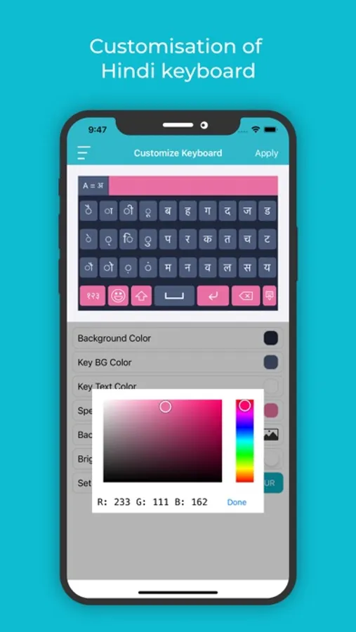 • Change colors for the Background colour, Key background colour, Keyboard text colour, Suggestion box colour etc, so that typing does not seem boring and monotonous with this Hindi keyboard for iOS.