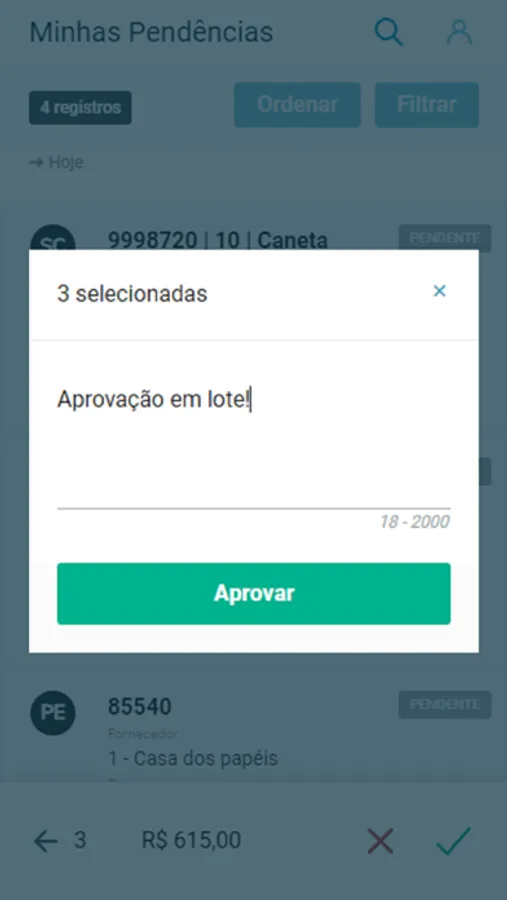 - Aprovar e/ou rejeitar diversas pendências em lote. Selecione quantas pendências precisar e execute a ação apenas uma vez.