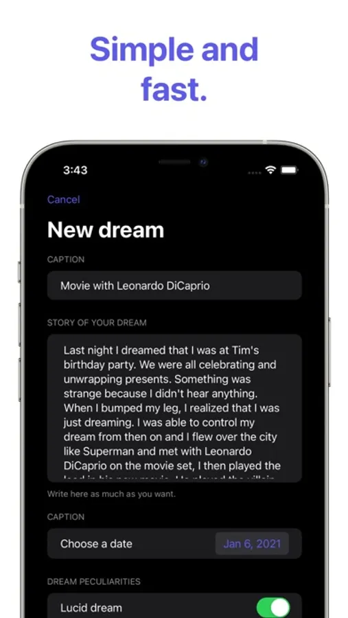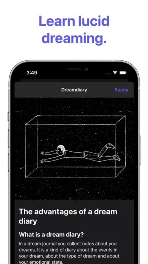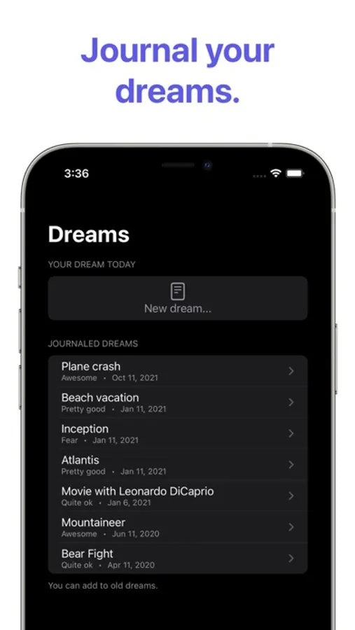 Learn to dream lucidly by writing down your dreams. With DreamLog you can journal an unlimited number of dreams and learn through comprehensive statistics. Concentrated on the essentials and easy to use. Try it out today.