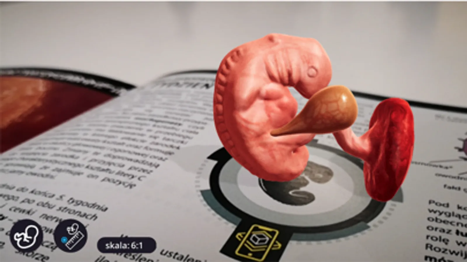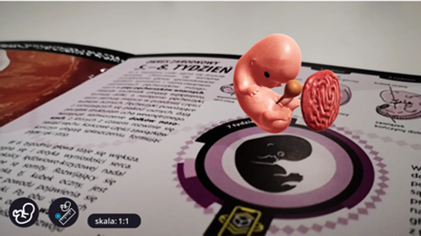 Po otworzeniu książki, uruchom aplikację i skieruj obiektyw aparatu na lewą lub prawą stronę. Po lewej stronie uruchomi się filmik edukacyjny, a po prawej pojawi się model 3D.