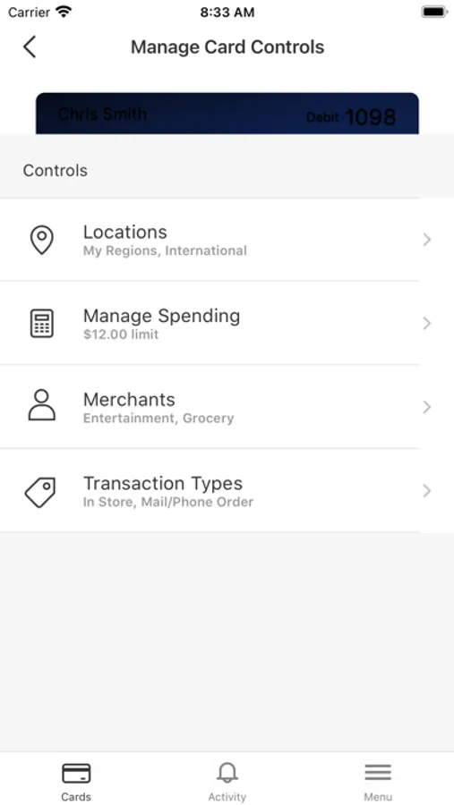 Real-time alerts for PIN and signature transactions keep you informed of your card usage to quickly detect unauthorized or fraudulent activity. Location-Based Controls and Alerts Restrict transactions to merchants near your location (using your phone’s GPS) or by region using city, state, country or zip code on an interactive map.