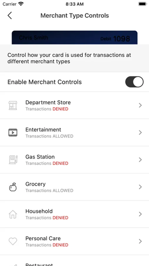 Set spending limits to decline transactions above your thresholds. Monitor activity by category such as gas stations and restaurants, and by type: in-store purchases, e-commerce transactions and ATM transactions.