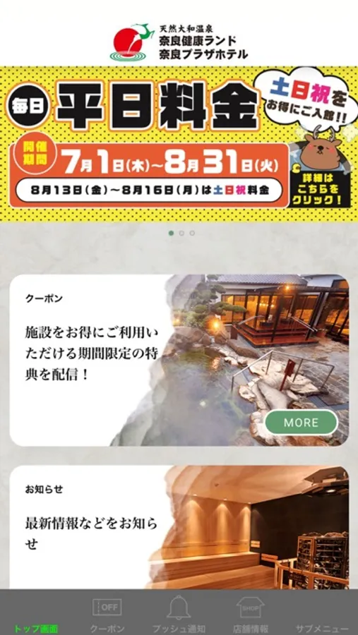 いつもよりお得に使える限定ものや館内で使えるクーポンなどご用意。