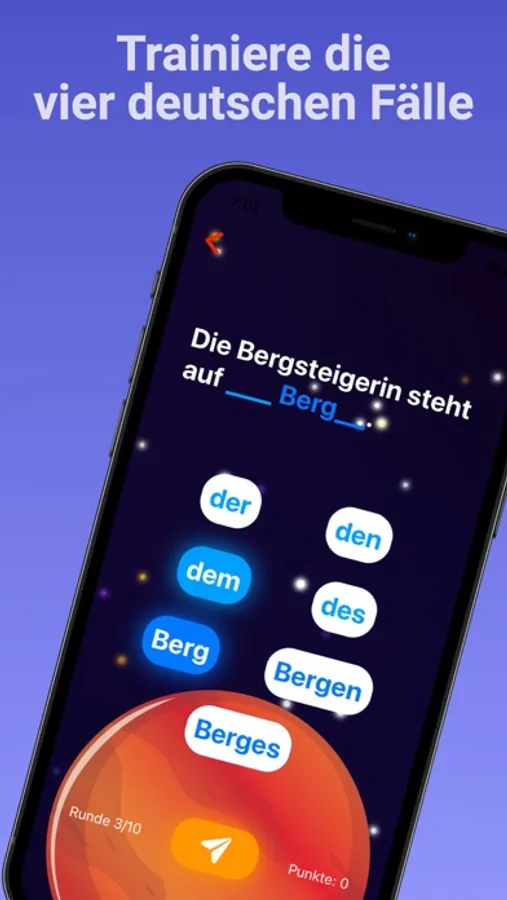 - 2 Spielmodi: Bestimme den Fall eines Wortes im Satz, oder setze Wörter im richtigen Fall in einen Satz ein.