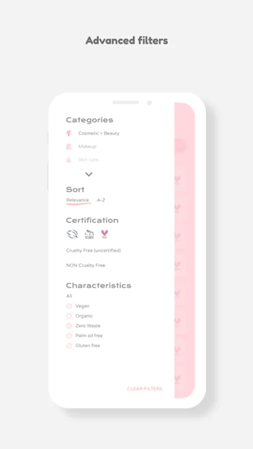• Filters: filter the list by categories, cruelty-free certificates and characteristics (vegan, organic, zero waste, palm oil free, gluten free...)