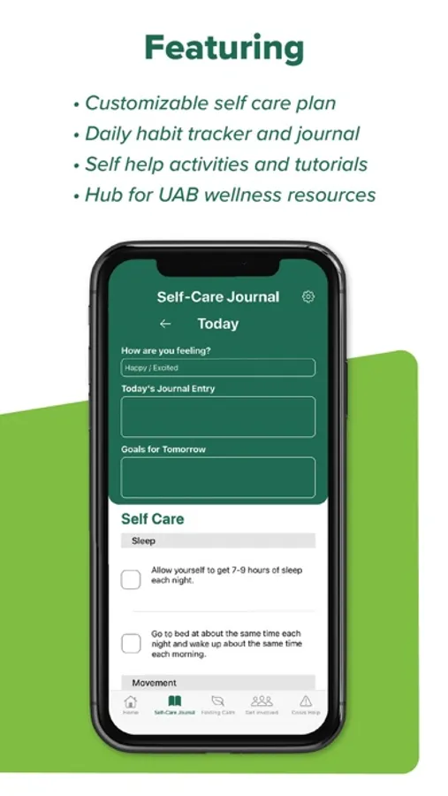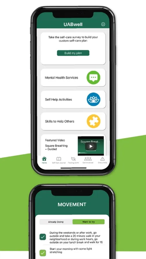 Students at the University of Alabama at Birmingham can use the UABwell app to create a personalized self-care plan that builds good habits in sleep, movement, nutrition routine and resiliency. The habit checklist and wellness journal — visible only to you — help you meet your goals and track your journey to better self-care and mental health. In addition, self-help tools in the app put mental health services, mindfulness resources, and campus mental health and recreation events at your fingertips. Crisis help is also available. Build your plan today to help reach your mental health and wellness goals.
