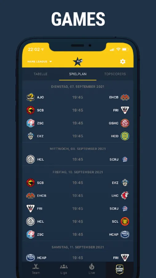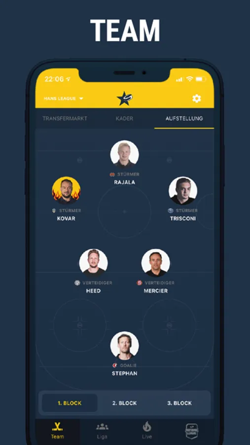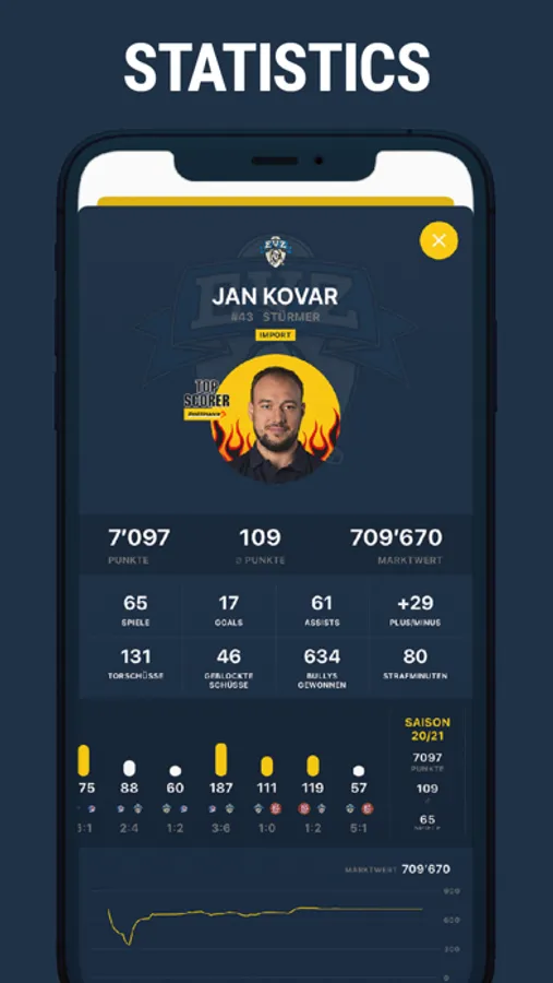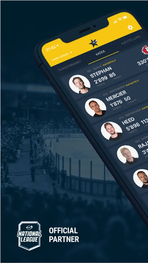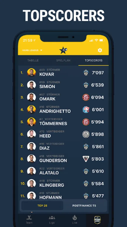 In the Topscorers app, users compete against each other in a league by putting together the most competitive ice hockey team possible from current National League professionals with a set budget. In each league, each hockey player exists only once. Before a game day, each user puts together his team from the players available to him. The sum of the points collected in real time for each player results in the total number of points for his team per game day. The users play to win the regular season (qualifier) and the playoffs (champion).