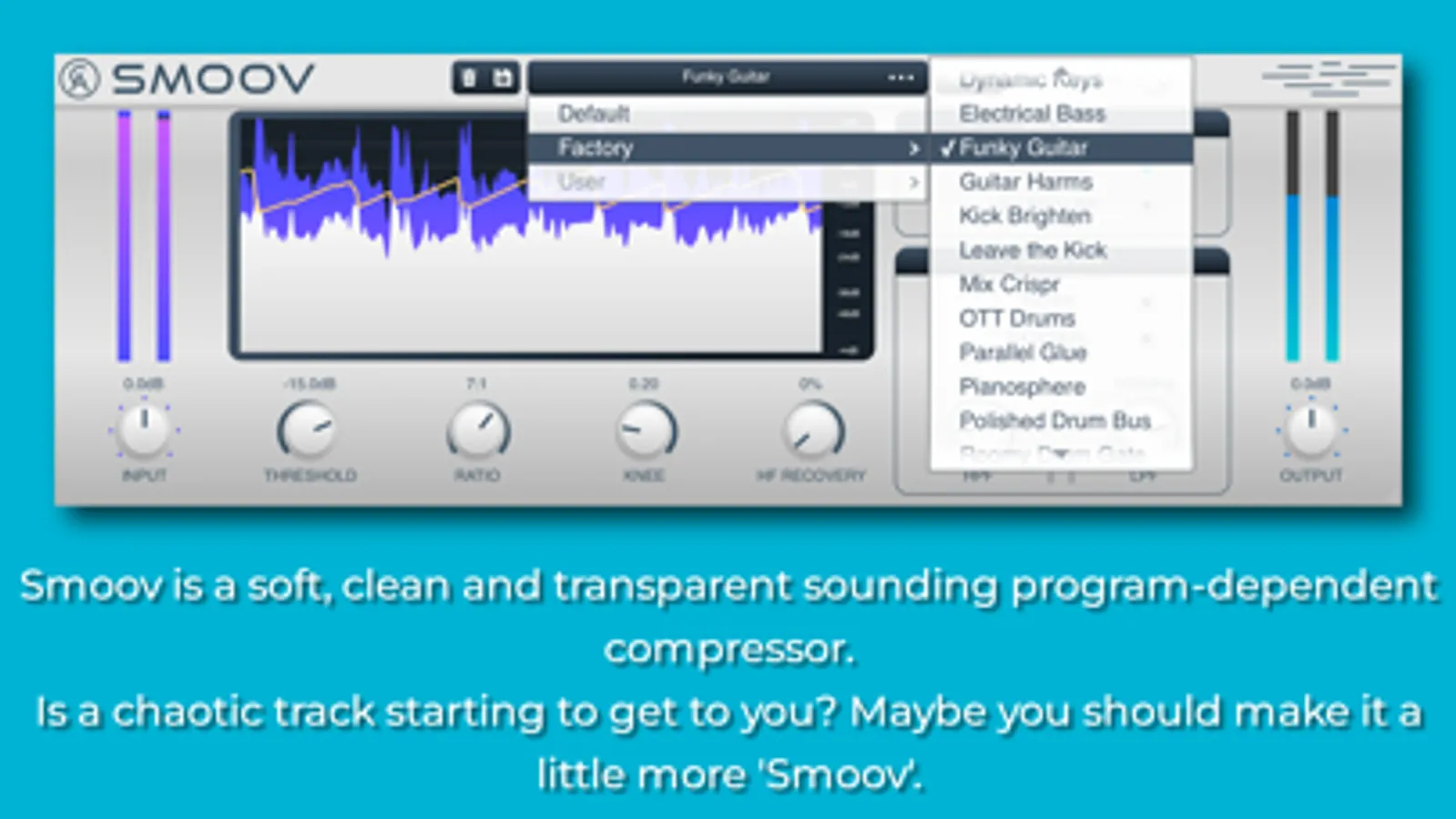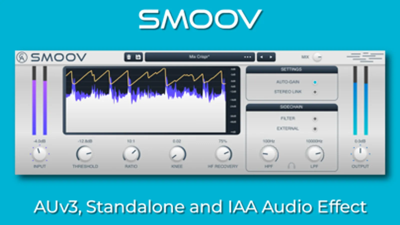 Smoov is a soft, clean and transparent sounding program-dependent AUv3, IAA & standalone compressor. It takes inspiration from hardware compressors of the past, however it focuses on peak detection meaning that it can quickly and effortlessly react to incoming signals and blend them in with the surrounding audio field. When a busy track needs taming, Smoov softly settles your tracks elegantly.