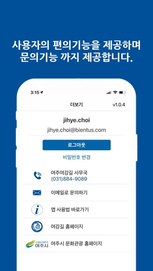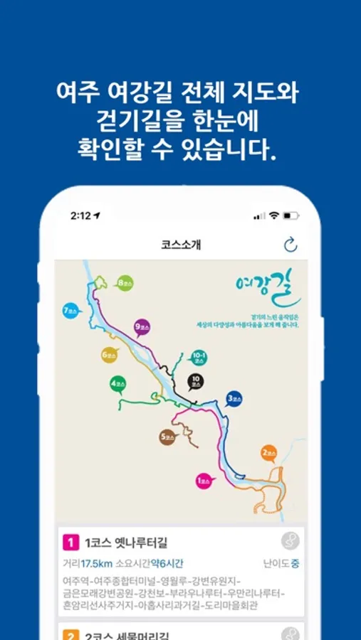 걷기에 최적화된 ‘여주여강길’ 앱은 2020년 개통된 6코스를 포함해 총11개 코스의 길찾기, 완보인증, 길정보 등을 서비스 합니다.