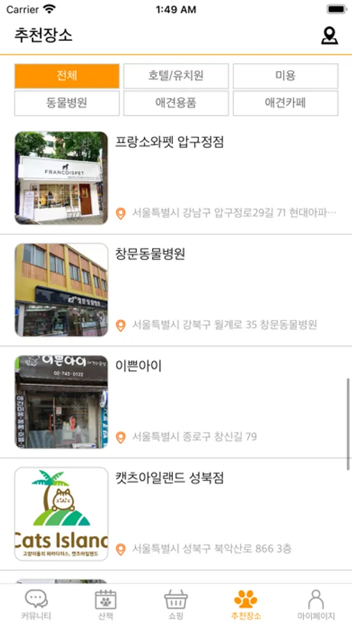 "킁킁킁" 내주변 미용, 호텔, 유치원, 동물병원등 다양한 추천장소를 제공하고 있습니다.