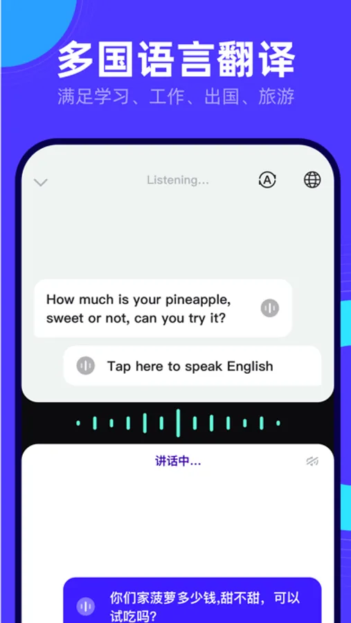 轻松翻译对话、语音、文本等,支持100多种语言,让你与任何国家的人都能轻松顺畅地沟通。