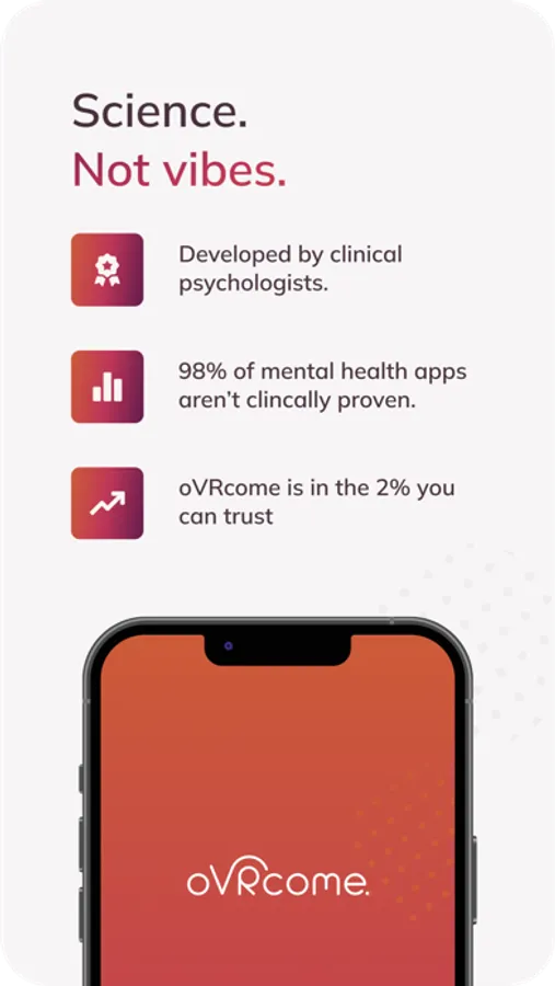 oVRcome has been developed in a clinical setting, backed by a robust body of academically accepted, evidence based, peer reviewed literature. It encapsulates the inner workings of psychological theory and proven methodology, delivered in a user friendly, intuitive, and calming package. Best of all, oVRcome is immediately accessible through the convenience, familiarity, and simplicity of your smartphone.