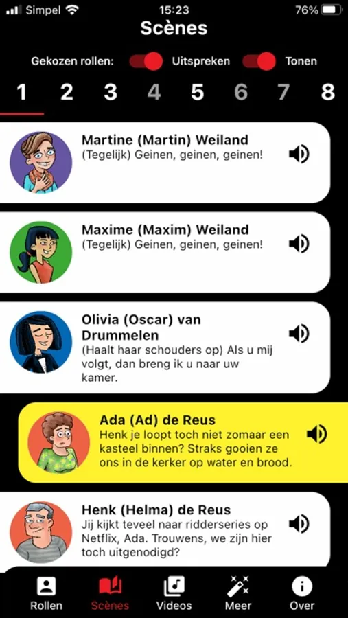 Kies de versie voor het exacte aantal spelers in je klas en oefen alle scènes waarin je speelt. In de deluxe versie oefen je ook hóe je een tekst zegt met het ingesproken script!