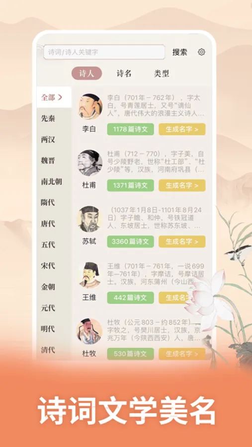2 诗词分类:可以根据诗词的作者,类型,诗名筛选
